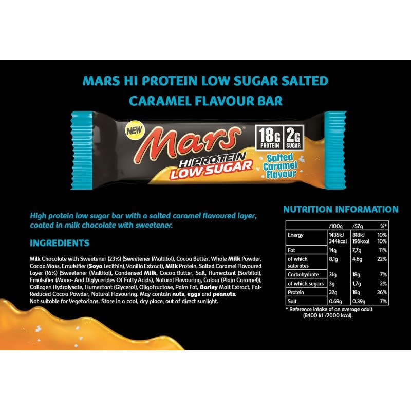Mars Low Sugar HiProtein Bar is a popular protein bar that looks and tastes just like the classic Mars bar, but contains up to 18 g of protein and has a significantly reduced content of carbohydrates, sugars and fats. This special edition has only 201 calories.