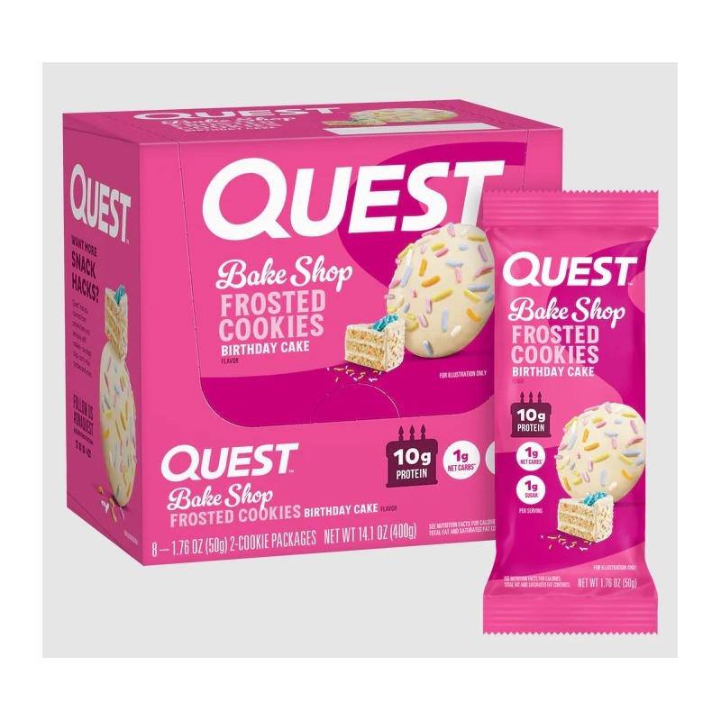 Get double the Big taste and athlete-worthy nutrition of soft and chewy Quest™ Frosted Cookies with twin packs. The indulgent tastes of Chocolate Cake or Birthday Cake - in a cookie. Quest Frosted Cookies satisfy your hunger with 5g of protein, and your sweet tooth, with less than 1g of sugar and 1g of net carbs. Keto-friendly.