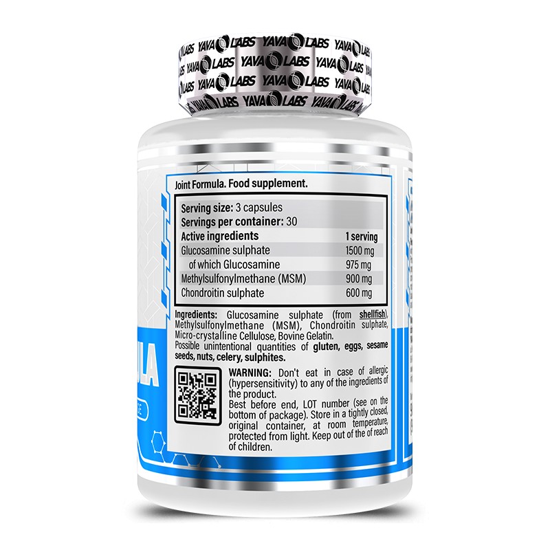 Each pack of Yava Labs joint formula has 90 capsules enough for 30 servings. A serving constitutes 3 capsules. It primarily contains Glucosamine 1500mg, Chondroitin 600mg, and MSM 900mg. Other ingredients are vegetable hydroxypropyl methylcellulose (HPMC) and possible unintentional quantities of gluten, eggs, sesame seeds, nuts, celery, sulphites.