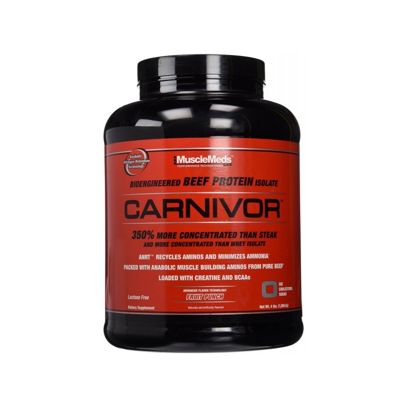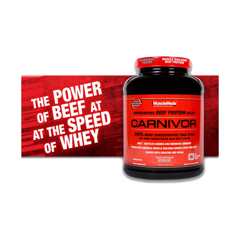 Beef Protein Isolate Project Overview. MuscleMeds reveals the exciting behind-the-scene developments of their revolutionary scientific breakthroughs in Protein Supplement technology, which led to the invention of the world’s first pharmaceutical grade beef protein isolate supplement - CARNIVOR. Never before released information about the creation of the World’s First Beef Protein Isolate that is 350% more concentrated than steak and more concentrated than whey. Using proprietary extraction, clarification, hydrolysis and isolation technologies enabled CARNIVOR's Bioengineered Beef Protein Isolate to deliver the muscle building power of beef with higher amino acid levels than all other protein sources used in supplements including whey, soy, milk and egg. CARNIVOR Beef Protein Isolate is even 350% more concentrated in anabolic muscle building amino acidsthan a prime sirloin steak! And it has no fat or cholesterol!