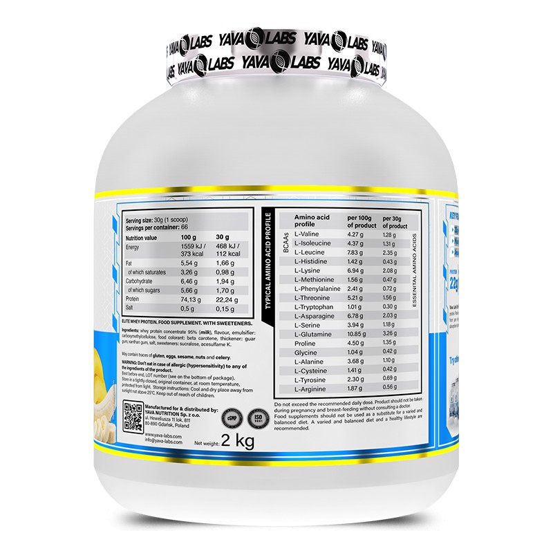 Elite Whey Protein from Yava Labs is a popular bodybuilding supplement used to boost dietary protein intake, often intending to increase muscle hypertrophy. We produce the product with modern advanced technology, thereby retaining the entire structure and activity of functional whey proteins and growth factors. It has the highest nutritional value and anabolic activity of any dietary protein. Our Elite Whey Protein has a high nutritional value because of its outstanding digestibility, absorption and optimal proportions of essential and non-essential amino acids, as well as an extraordinarily high proportion of protein, branched-chain amino acids (BCAAs), leucine, and glutamine. In conjunction with resistance exercise, Elite Whey Protein enhances muscle protein synthesis and encourages lean muscle mass growth.
