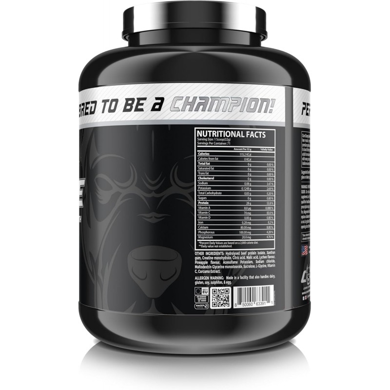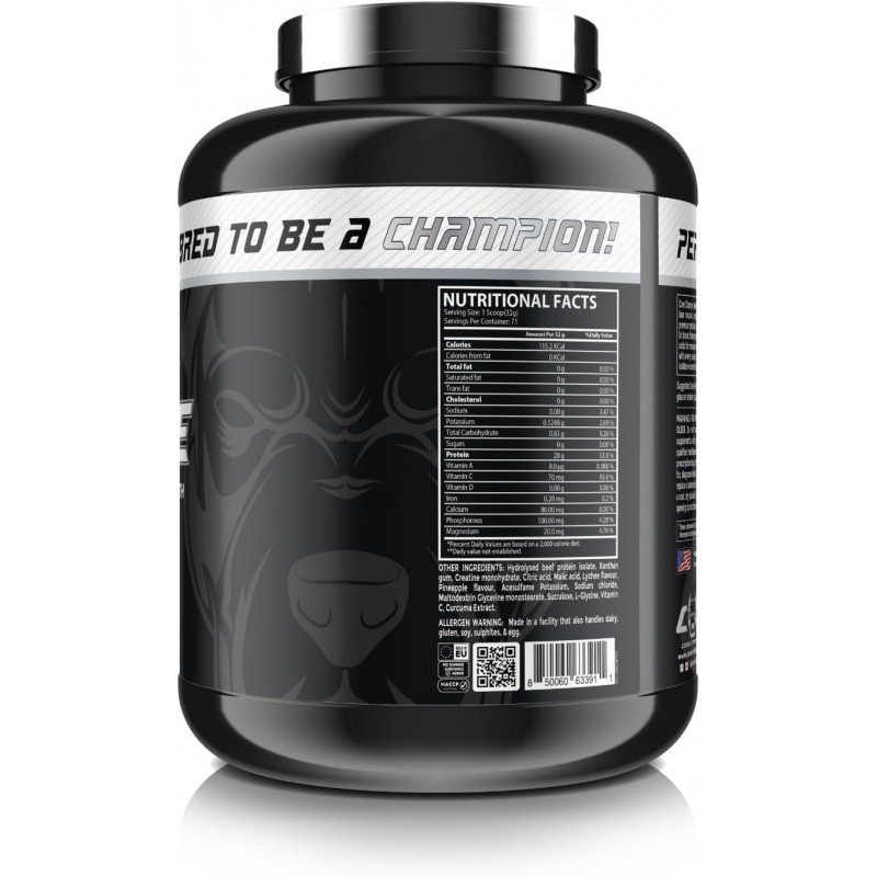 Hydrolysed beef protein isolate, Xanthan gum, Creatine monohydrate, Citric acid, Malic acid, Lychee flavour, Pineapple flavour, Acesulfame Potassium, Sodium chloride, Maltodextrin Glycerine monostearate, Sucralose, L-Clycine, Vitamin C, Curcuma Extract.