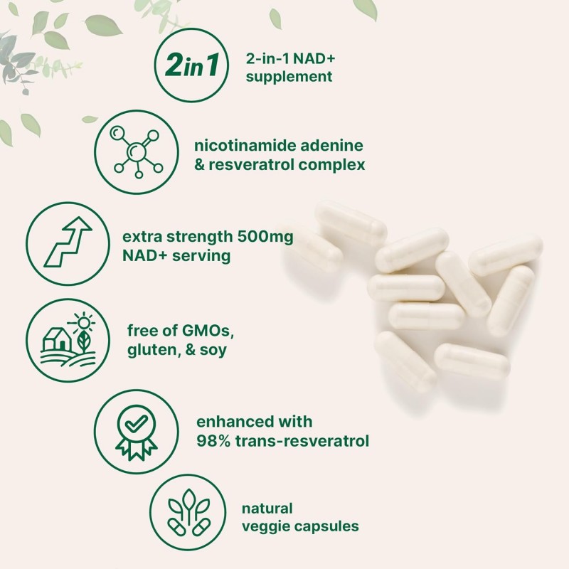 Each bottle includes 240 natural vegetarian capsules. Provides Nicotinamide Adenine (NAD) enhanced with Resveratrol from a potent Japanese Knotweed Extract.