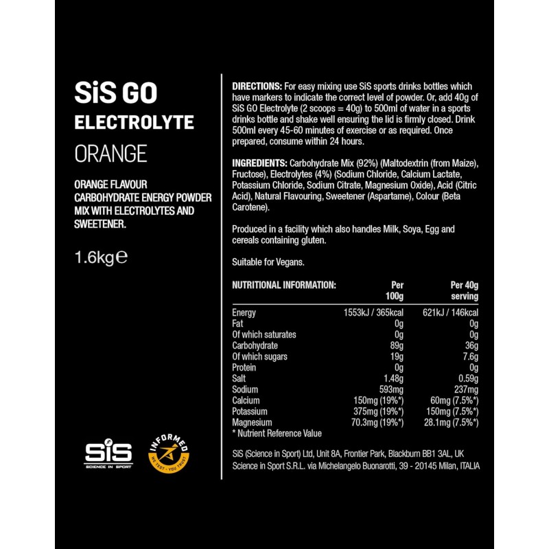 The GO Electrolyte Powder provide a blend of easily digestible and quick supply of carbohydrate (36 grams as a 6% solution) and electrolytes, including sodium at a concentration of 20mmol/L.