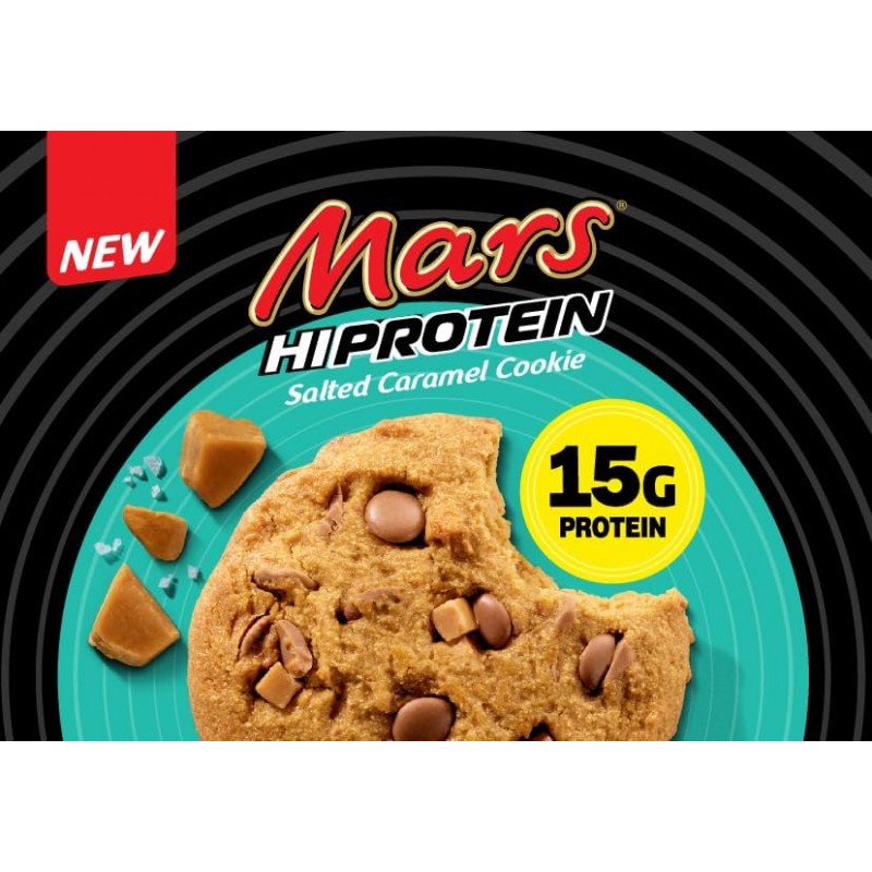 Mars Hi-Protein Choc Caramel Cookie with generous chocolate chips and caramel fudge chunks, containing 15g protein!! A new Mars innovation, one where your want for sweet-treats and desire for guilt-free tasty treats needs are met.