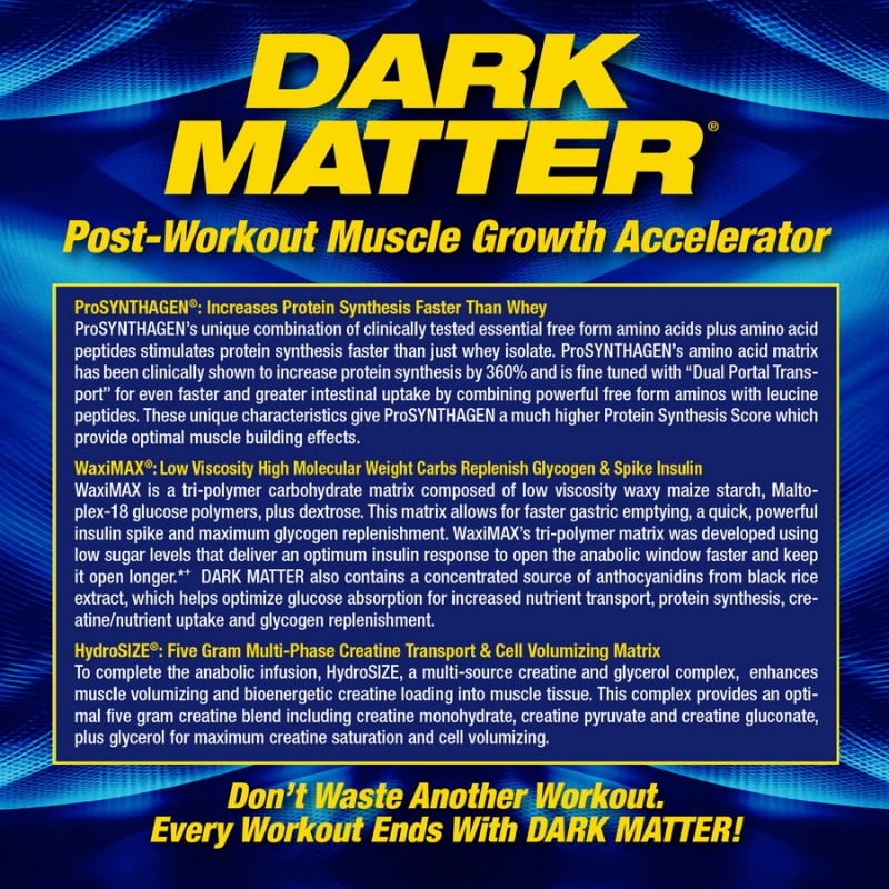 If you want to start gaining serious size, chug down some DARK MATTER after your workouts and introduce your muscles to proven formulation for muscle growth and recovery. DARK MATTER is formulated for maximum speed, bio-effectiveness and precise nutrient timing for optimal post-workout replenishment during the “anabolic window” immediately after your workout.*